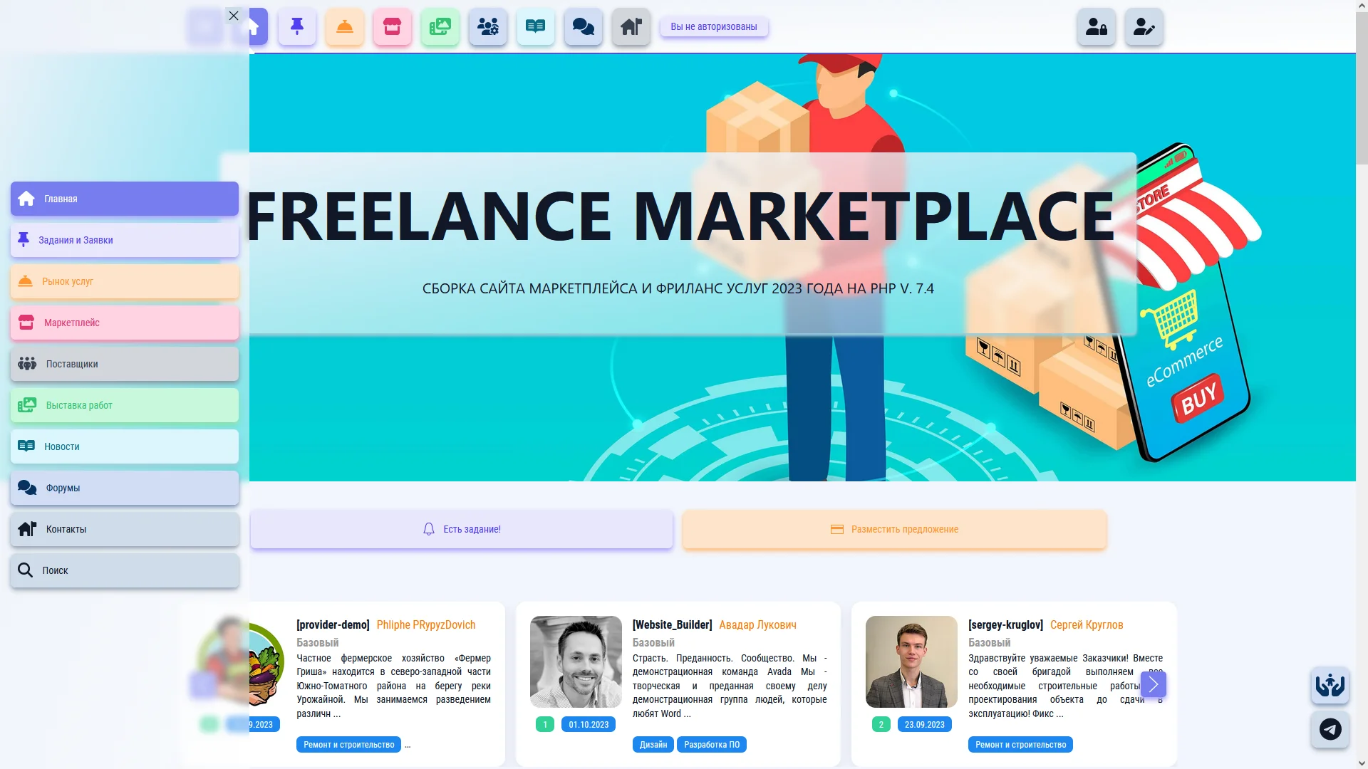 Встречайте обновленную в августе 2023 года, переработанную и расширенную сборку модулей и плагинов готового сайта, для создания маркетплейса услуг и товаров с новым адаптивным шаблоном. Основные разделы сайта торговой площадки товаров и 2 сентября 2023