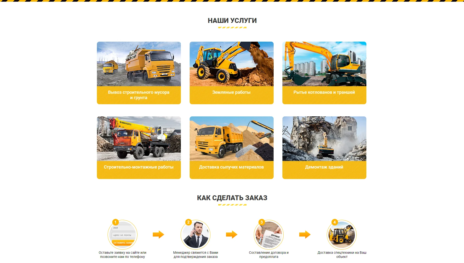 • Многофункциональная форма заявки (при заказе спецтехники - название спецтехники и данные заказчика отправляются на почту владельца сайта).