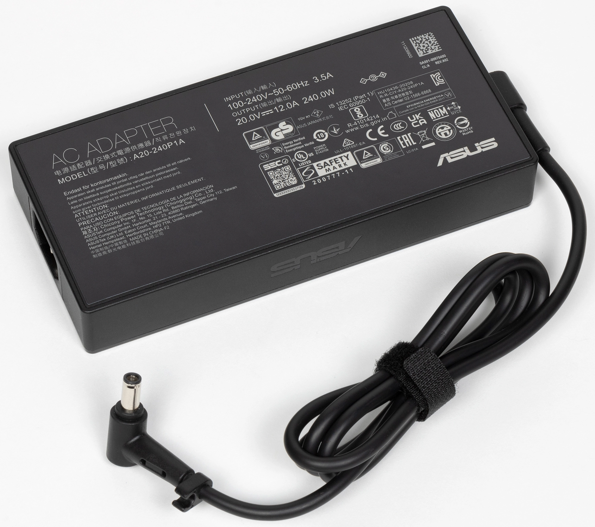В комплекте с ноутбуком, не считая бумажной документации и листовки серии TUF, идет только 240-ваттный адаптер питания с сетевым шнуром (длиной 1,75 м) и своим кабелем длиной 1,15 м. Адаптер питания не самый большой и не самый тяжелый из того, что мы видели, но все-таки это далеко не компактный походный вариант.